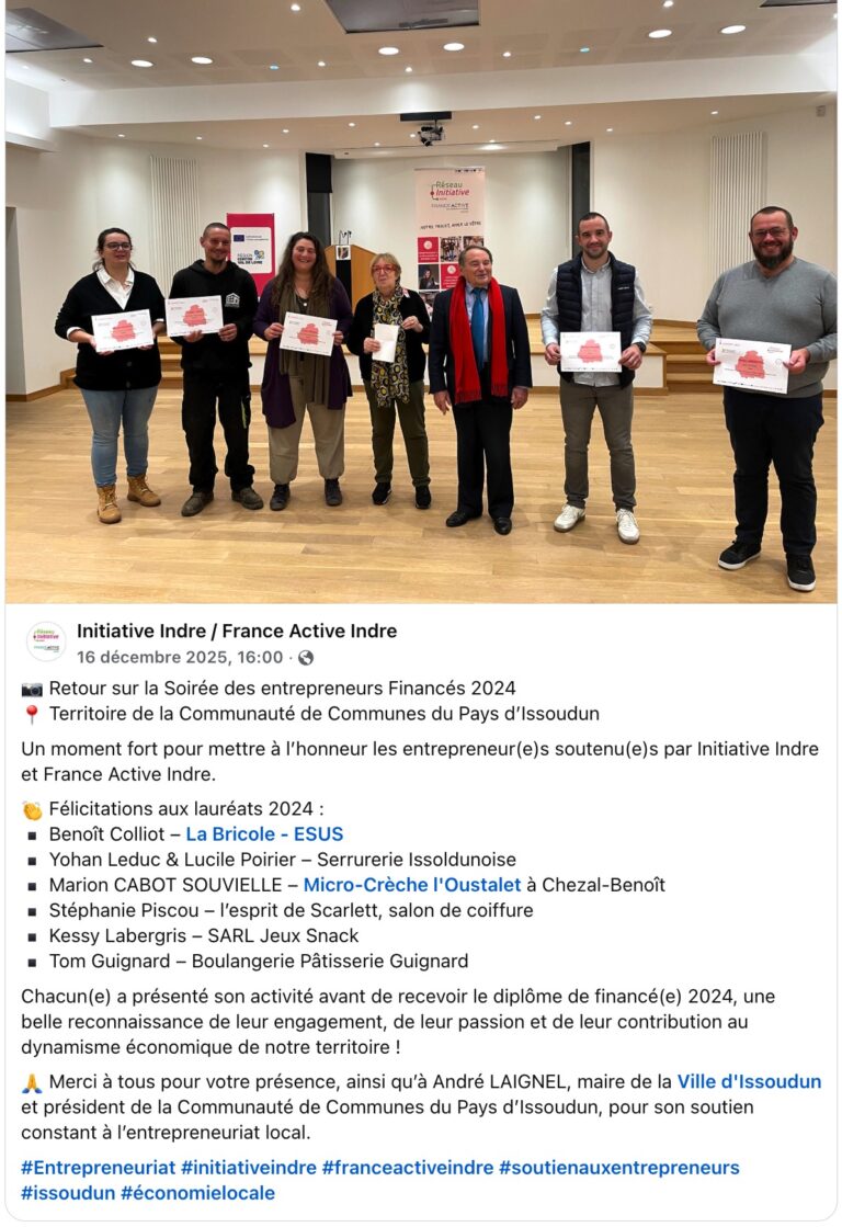 Merci à Initiative Indre / France Active Indre et à tous les acteurs qui soutiennent l’entrepreneuriat sur notre territoire.